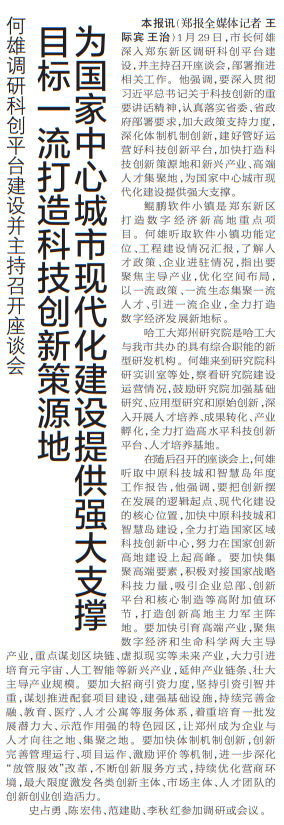 1月29日,市长何雄深入郑东新区调研科创平台建设,并主持召开座谈会,部署推进相关工作。他强调,要深入贯彻习近平总书记关于科技创新的重要讲话精神,认真落实省委、省政府部署要求,加大政策支持力度,深化体制机制创新,建好管好运营好科技创新平台,加快打造科技创新策源地和新兴产业、高端人才集聚地,为国家中心城市现代化建设提供强大支撑。(今日《郑州日报》1版)