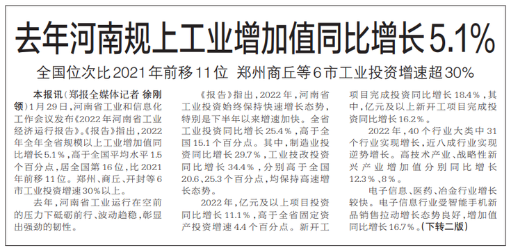 1月29日,河南省工业和信息化工作会议发布《2022年河南省工业经济运行报告》。《报告》指出,2022年全年全省规模以上工业增加值同比增长5.1%,高于全国平均水平1.5个百分点,居全国第16位,比2021年前移11位。郑州、商丘、开封等6市工业投资增速30%以上。(今日《郑州日报》1版、2版)
