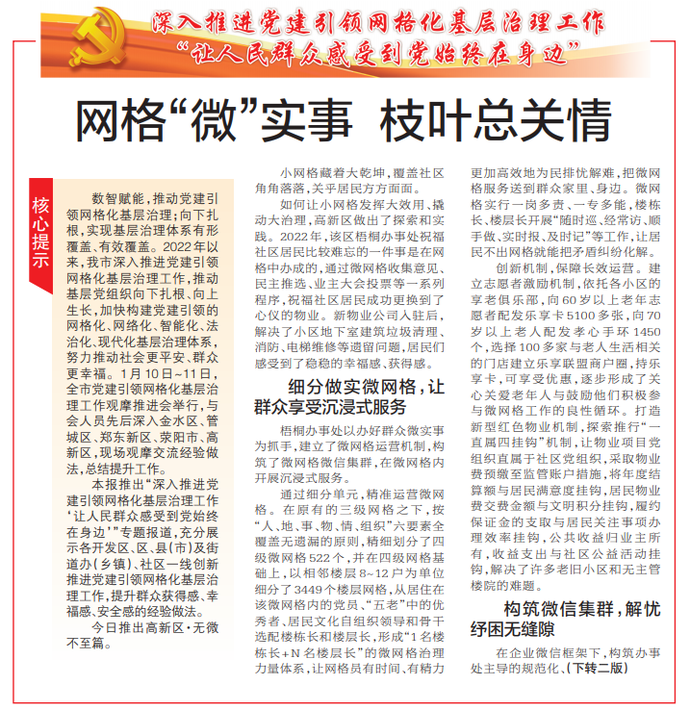 本报推出“深入推进党建引领网格化基层治理工作‘让人民群众感受到党始终在身边’”专题报道,充分展示各开发区、区、县(市)及街道办(乡镇)、社区一线创新推进党建引领网格化基层治理工作,提升群众获得感、幸福感、安全感的经验做法。