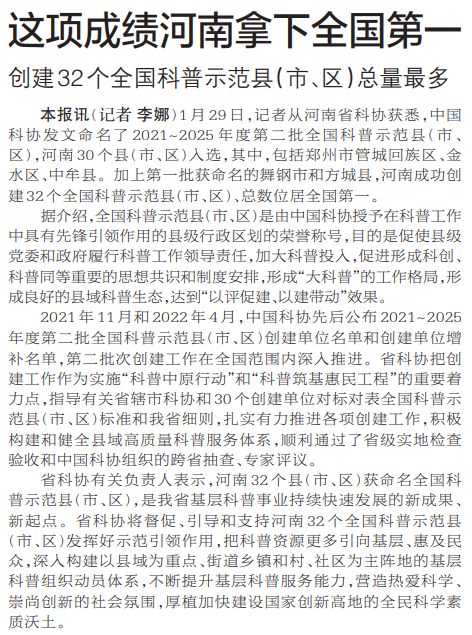 1月29日,记者从河南省科协获悉,中国科协发文命名了2021~2025年度第二批全国科普示范县(市、区),河南30个县(市、区)入选,其中,包括郑州市管城回族区、金水区、中牟县。加上第一批获命名的舞钢市和方城县,河南成功创建32个全国科普示范县(市、区)、总数位居全国第一。(今日《郑州日报》1版)