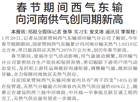 1月29日,记者从国家管网西气东输郑州输气分公司了解到,今年春节假期期间,国家管网西气东输累计向河南分输天然气1.9219亿立方米,单日最高供应天然气2879万立方米,创历年春节新高。(今日《郑州日报》1版)