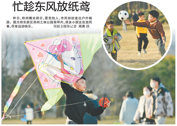 昨日,郑州晴光丽日,景色怡人,市民纷纷走出户外畅游。图为郑东新区郑州之林公园草坪内,很多小朋友在放风筝,尽享运动快乐。(今日《郑州日报》1版)