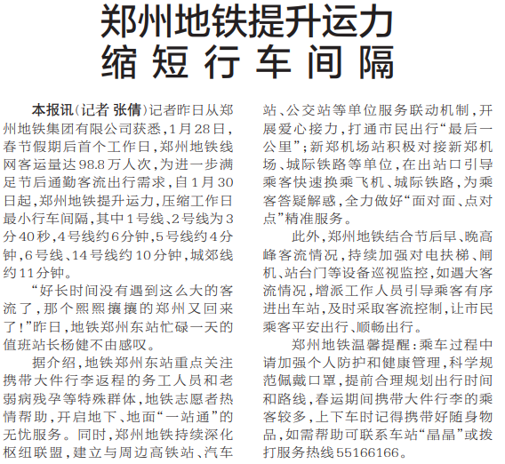 记者昨日从郑州地铁集团有限公司获悉,1月28日,春节假期后首个工作日,郑州地铁线网客运量达98.8万人次,为进一步满足节后通勤客流出行需求,自1月30日起,郑州地铁提升运力,压缩工作日最小行车间隔,其中1号线、2号线为3分40秒,4号线约6分钟,5号线约4分钟,6号线、14号线约10分钟,城郊线约11分钟。(今日《郑州日报》2版)
