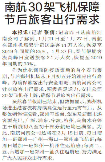 记者昨日从南航河南公司了解到,1月21日至1月27日,南航在郑州机场累计运送旅客11万人次,恢复至2019年同期的85%。1月27日,春节假期客流高峰日发送旅客2.1万人次,恢复至2019年同期的93%。(今日《郑州日报》2版)