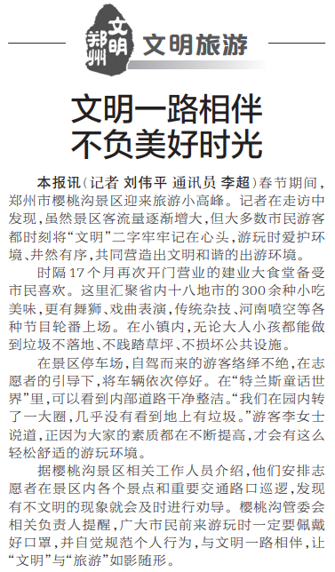 春节期间,郑州市樱桃沟景区迎来旅游小高峰。记者在走访中发现,虽然景区客流量逐渐增大,但大多数市民游客都时刻将“文明”二字牢牢记在心头,游玩时爱护环境、井然有序,共同营造出文明和谐的出游环境。(今日《郑州日报》2版)