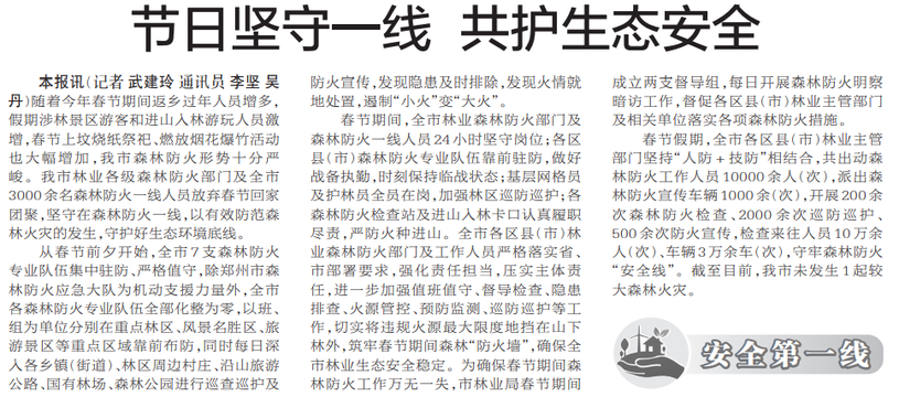 随着今年春节期间返乡过年人员增多,假期涉林景区游客和进山入林游玩人员激增,春节上坟烧纸祭祀、燃放烟花爆竹活动也大幅增加,我市森林防火形势十分严峻。我市林业各级森林防火部门及全市3000余名森林防火一线人员放弃春节回家团聚,坚守在森林防火一线,以有效防范森林火灾的发生,守护好生态环境底线。(今日《郑州日报》2版)