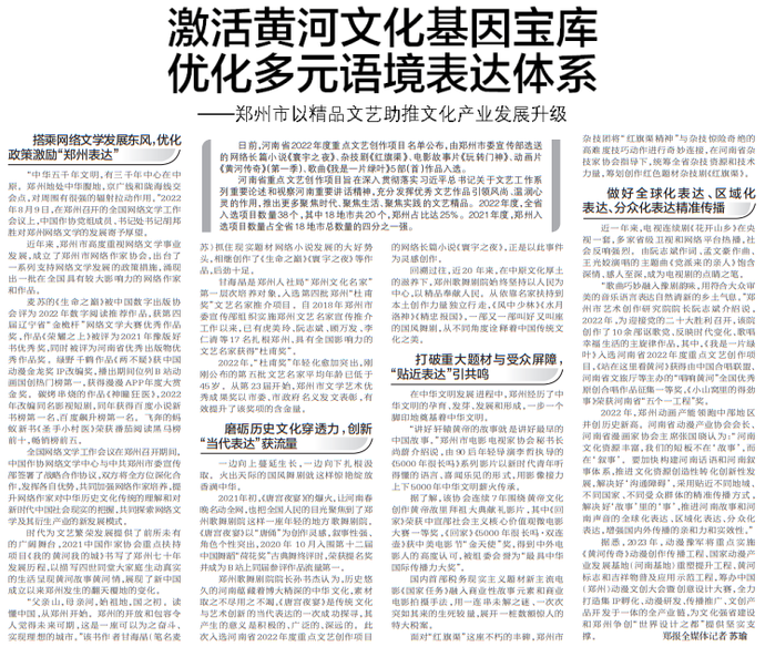 日前,河南省2022年度重点文艺创作项目名单公布,由郑州市委宣传部选送的网络长篇小说《寰宇之夜》、杂技剧《红旗渠》、电影故事片《玩转门神》、动画片《黄河传奇》(第一季)、歌曲《我是一片绿叶》5部(首)作品入选。