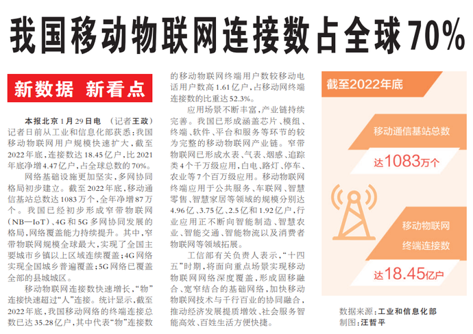 记者日前从工业和信息化部获悉:我国移动物联网用户规模快速扩大,截至2022年底,连接数达18.45亿户,比2021年底净增4.47亿户,占全球总数的70%。(今日《人民日报》1版)