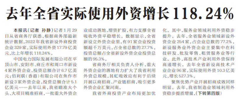 记者1月29日从省商务厅获悉,根据商务部最新统计数据,2022年我省新设外商投资企业329家,实际使用外资17.79亿美元,比上年增长118.24%。(今日《河南日报》1版)