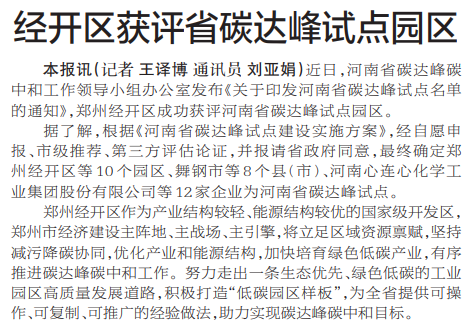 近日,河南省碳达峰碳中和工作领导小组办公室发布《关于印发河南省碳达峰试点名单的通知》,郑州经开区成功获评河南省碳达峰试点园区。(今日《郑州日报》5版)