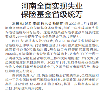 自2023年1月1日起,河南全面实现失业保险基金省级统筹,提前一年完成国家失业保险省级统筹目标任务。这是我省失业保险事业改革发展的重要成果,进一步提升了失业保险基金互助共济能力。(今日《郑州日报》1版)