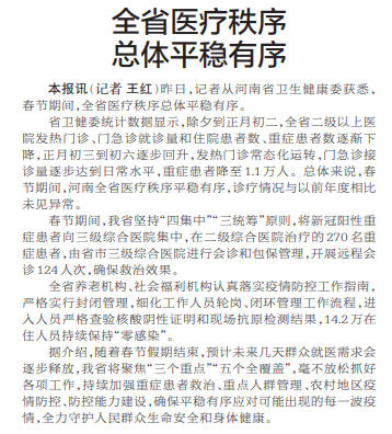 昨日,记者从河南省卫生健康委获悉,春节期间,全省医疗秩序总体平稳有序。(今日《郑州日报》1版)