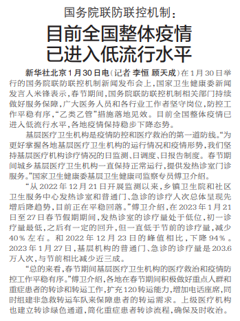 在1月30日举行的国务院联防联控机制新闻发布会上,国家卫生健康委新闻发言人米锋表示,春节期间,国务院联防联控机制相关部门持续做好服务保障,广大医务人员和各行业工作者坚守岗位,防控工作平稳有序,“乙类乙管”措施落地见效。目前全国整体疫情已进入低流行水平,各地疫情保持稳步下降态势。(今日《郑州日报》1版)