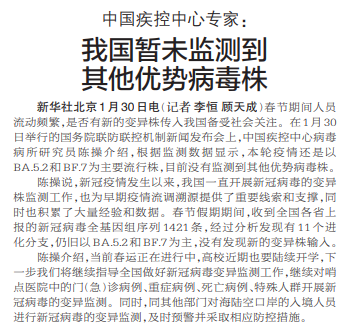 春节期间人员流动频繁,是否有新的变异株传入我国备受社会关注。在1月30日举行的国务院联防联控机制新闻发布会上,中国疾控中心病毒病所研究员陈操介绍,根据监测数据显示,本轮疫情还是以BA.5.2和BF.7为主要流行株,目前没有监测到其他优势病毒株。(今日《郑州日报》1版)