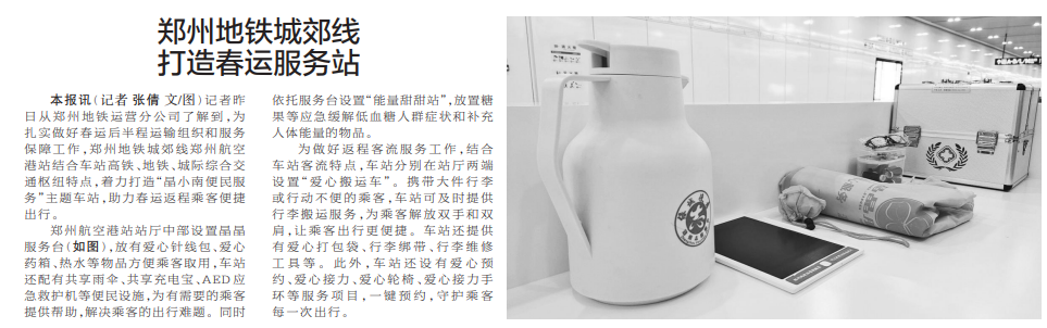 记者昨日从郑州地铁运营分公司了解到,为扎实做好春运后半程运输组织和服务保障工作,郑州地铁城郊线郑州航空港站结合车站高铁、地铁、城际综合交通枢纽特点,着力打造“晶小南便民服务”主题车站,助力春运返程乘客便捷出行。(今日《郑州日报》2版)