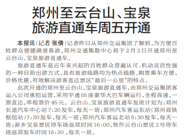 记者昨日从郑州交运集团了解到,为方便百姓群众便捷满意春游,郑州交通集散中心将于2月3日开通郑州至云台山、宝泉旅游直通车。(今日《郑州日报》2版)
