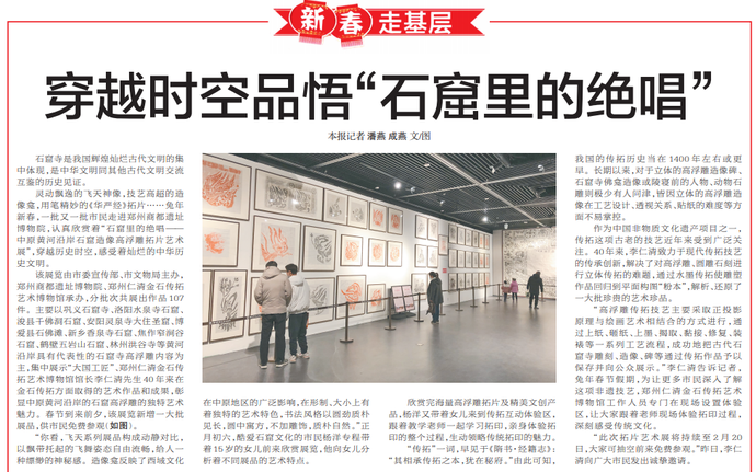 灵动飘逸的飞天神像,技艺高超的造像龛,用笔精妙的《华严经》拓片……兔年新春,一批又一批市民走进郑州商都遗址博物院,认真欣赏着“石窟里的绝唱——中原黄河沿岸石窟造像高浮雕拓片艺术展”,穿越历史时空,感受着灿烂的中华历史文明。(今日《郑州日报》5版)