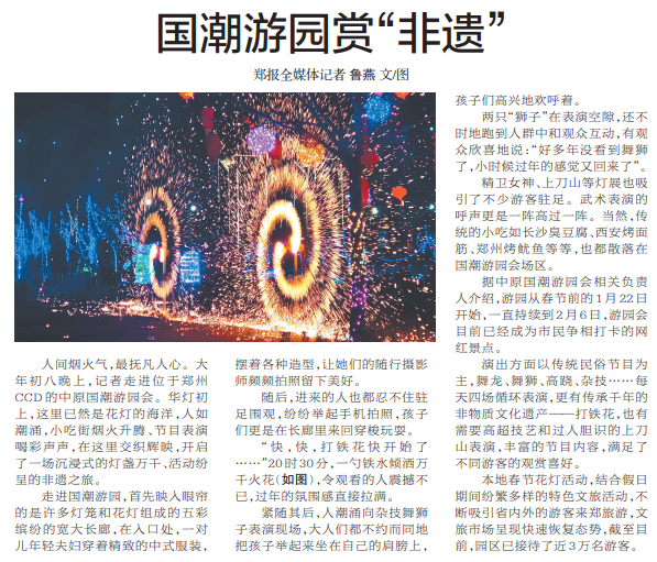 人间烟火气,最抚凡人心。大年初八晚上,记者走进位于郑州CCD的中原国潮游园会。华灯初上,这里已然是花灯的海洋,人如潮涌,小吃街烟火升腾、节目表演喝彩声声,在这里交织辉映,开启了一场沉浸式的灯盏万千、活动纷呈的非遗之旅。(今日《郑州日报》5版)