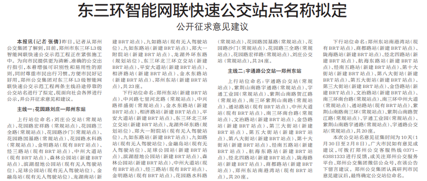 昨日,记者从郑州公交集团了解到,目前,郑州市东三环L3级智能网联快速公交示范工程正在紧张施工中。为向市民提供更为清晰、准确的公交出行指引,本着增强可识别性和易用性的原则,同时尊重市民出行习惯,方便市民好记好用,郑州公交集团对东三环L3级智能网联快速公交示范工程两条主线沿途停靠的公交站名进行了拟定,现面向社会各界进行公示,并公开征求意见和建议。(今日《郑州日报》7版)