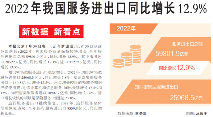 记者30日从商务部获悉:2022年,我国服务贸易保持较快增长,全年服务进出口总额59801.9亿元,同比增长12.9%。其中服务出口28522.4亿元,同比增长12.1%;进口31279.5亿元,同比增长13.5%。(今日《人民日报》1版)