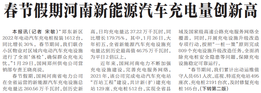 “郑东新区2022年电动汽车充电桩报装1612台,同比增长30%。春节期间,我们联合小区物业对区域内电动汽车充电设施进行了全面‘体检’,确保群众充电无忧。”1月29日,国网郑州供电公司营销部专责王晓亮说。(今日《河南日报》1版、2版)