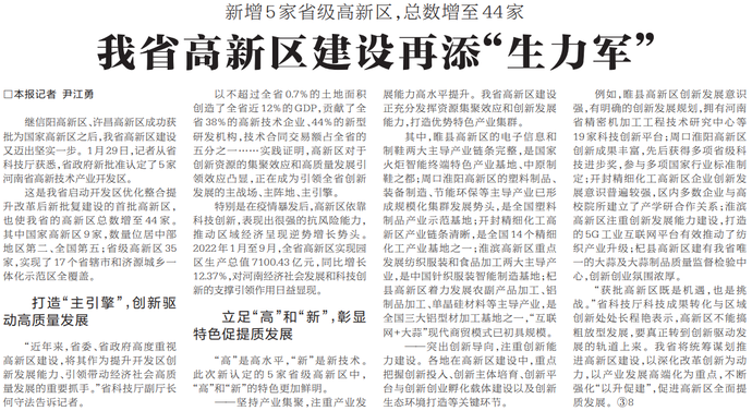 这是我省启动开发区优化整合提升改革后新批复建设的首批高新区,也使我省的高新区总数增至44家。其中国家高新区9家,数量位居中部地区第二、全国第五;省级高新区35家,实现了17个省辖市和济源城乡一体化示范区全覆盖。(今日《河南日报》1版)
