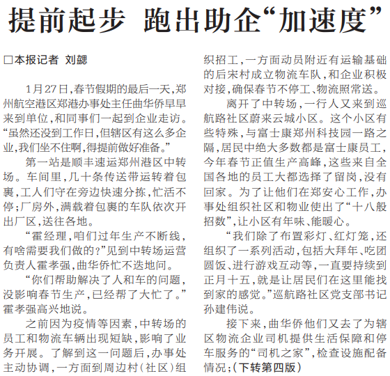 1月27日,春节假期的最后一天,郑州航空港区郑港办事处主任曲华侨早早来到单位,和同事们一起到企业走访。“虽然还没到工作日,但辖区有这么多企业,我们坐不住啊,得提前做好准备。”(今日《河南日报》1版、4版)