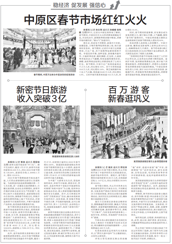 2023年春节假日期间,巩义市组织开展了丰富多彩的文化和旅游活动,旅游市场井然有序。据统计,春节假日期间共接待游客98.96万人次,实现旅游总收入 1.47亿元,同比分别增长30.04%和32.59%。(今日《郑州日报》7版)
