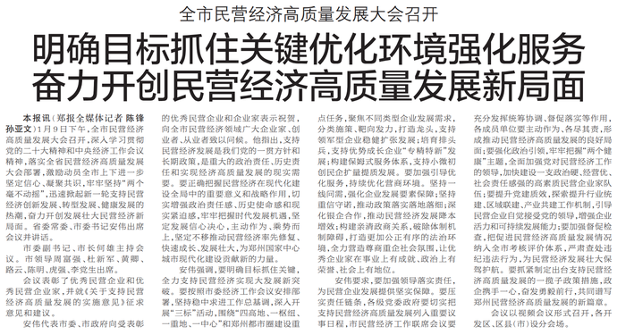 在全市上下深入学习贯彻落实党的二十大精神之际,我市召开民营经济高质量发展大会,对稳定市场主体预期、坚定市场主体信心、提振市场主体精神、激励广大企业家继续把企业做优做强做大,将产生极大的推动作用,也必将掀起新一轮支持民营经济创新发展、转型发展、健康发展的热潮。(今日《郑州日报》1版、2版)