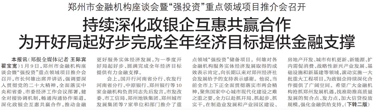 1月9日,郑州市金融机构座谈会暨“强投资”重点领域项目推介会召开,市长何雄出席并讲话,强调要深入贯彻党的二十大精神,全面落实中央和省委、市委经济工作会议部署,健全对接协调机制,畅通沟通协作渠道,深化政银企互惠共赢合作,推动金融更好服务实体经济发展,为一季度开好局起好步、圆满完成全年经济目标提供有力金融支撑。(今日《郑州日报》1版、2版)