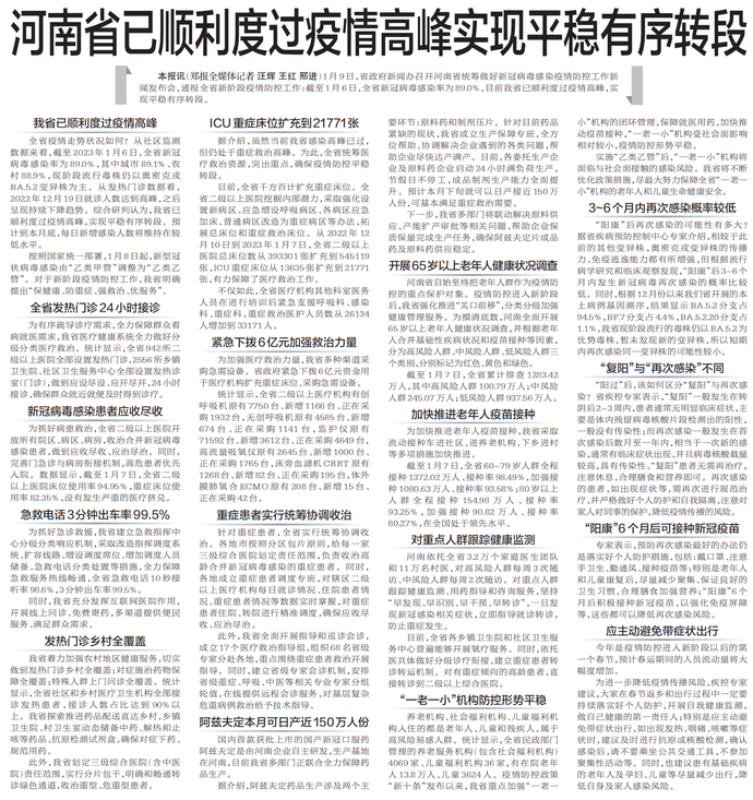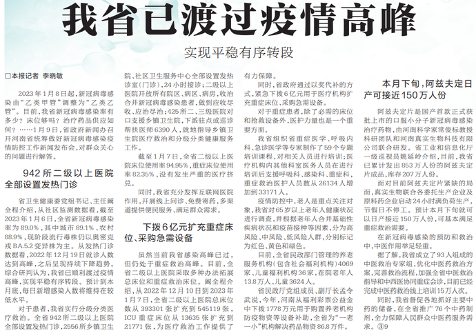 2023年1月8日起,新冠病毒感染由“乙类甲管”调整为“乙类乙管”。目前,我省新冠病毒感染率有多少?床位够吗?治疗药品供应如何?……1月9日,省政府新闻办召开河南省统筹做好新冠病毒感染疫情防控工作新闻发布会,对群众关心的问题进行解答。(今日《河南日报》5版)