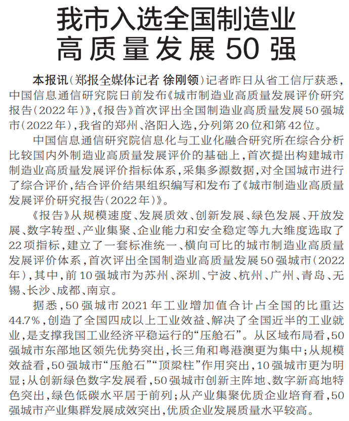 记者昨日从省工信厅获悉,中国信息通信研究院日前发布《城市制造业高质量发展评价研究报告(2022年)》,《报告》首次评出全国制造业高质量发展50强城市(2022年),我省的郑州、洛阳入选,分列第20位和第42位。(今日《郑州日报》2版)