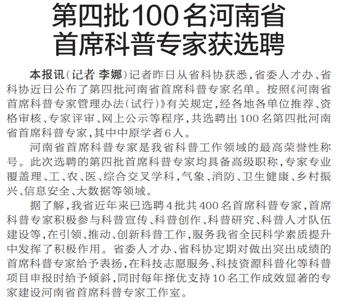 记者昨日从省科协获悉,省委人才办、省科协近日公布了第四批河南省首席科普专家名单。按照《河南省首席科普专家管理办法(试行)》有关规定,经各地各单位推荐、资格审核、专家评审、网上公示等程序,共选聘出100名第四批河南省首席科普专家,其中中原学者6人。(今日《郑州日报》2版)