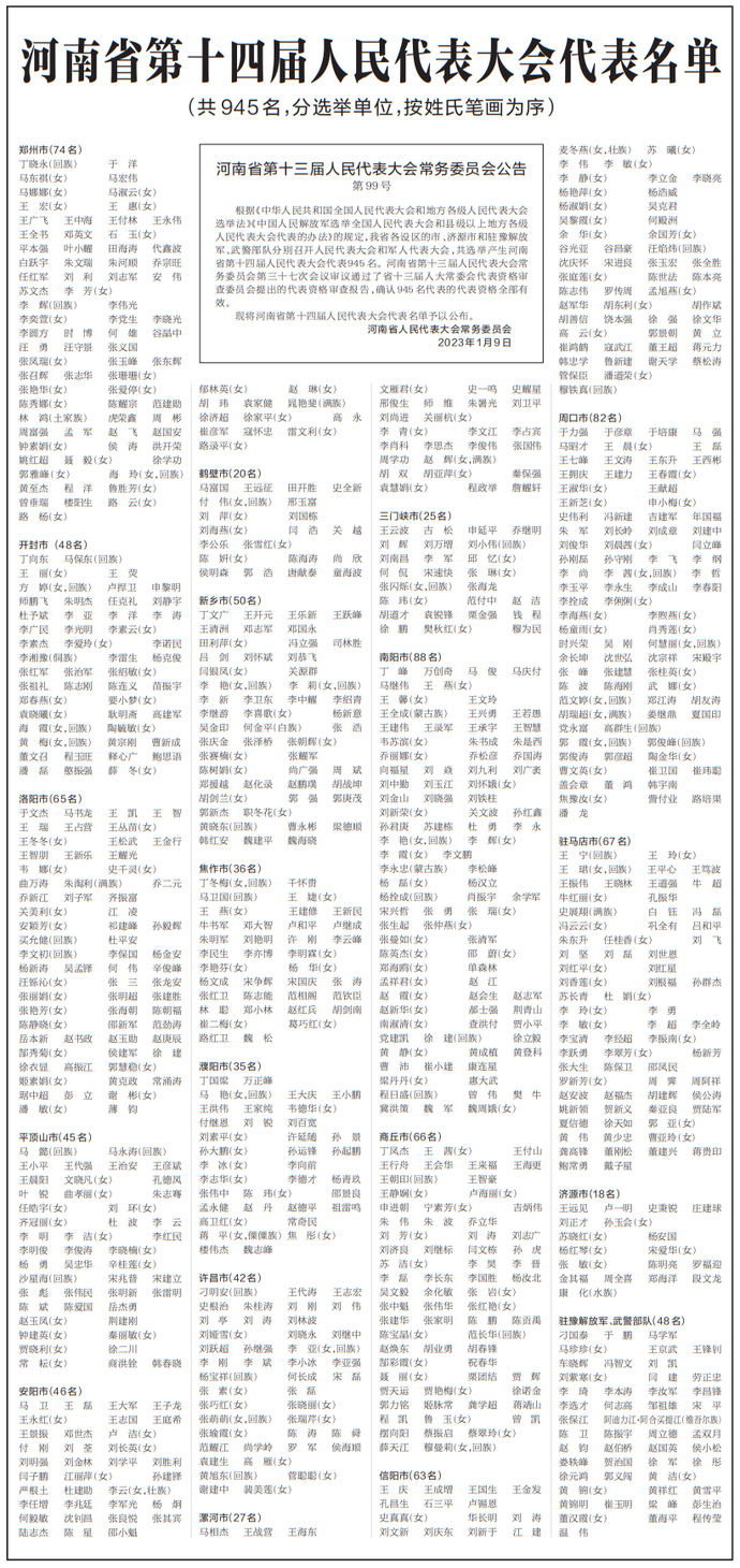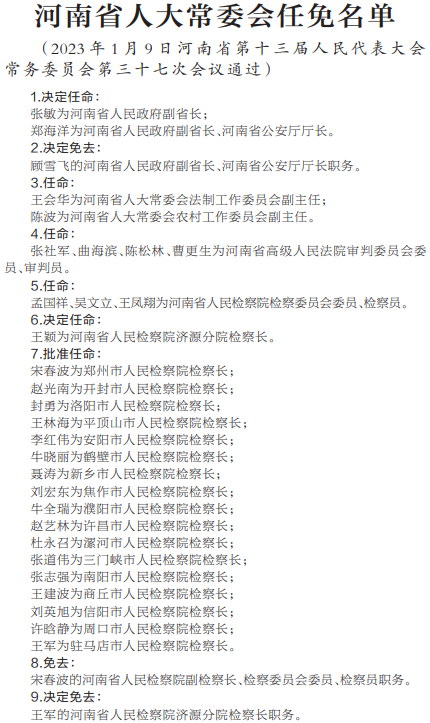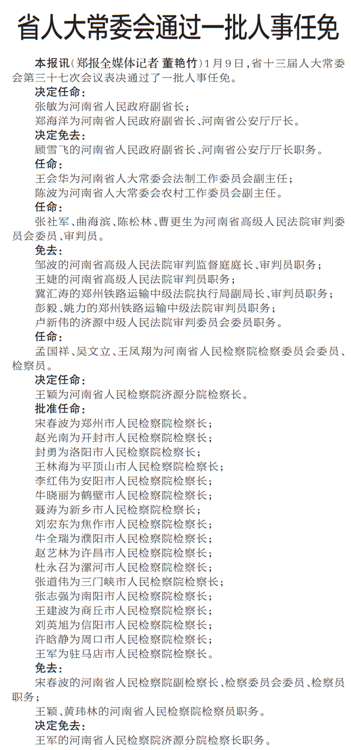 1月9日,省十三届人大常委会第三十七次会议表决通过了一批人事任免。(今日《郑州日报》2版)