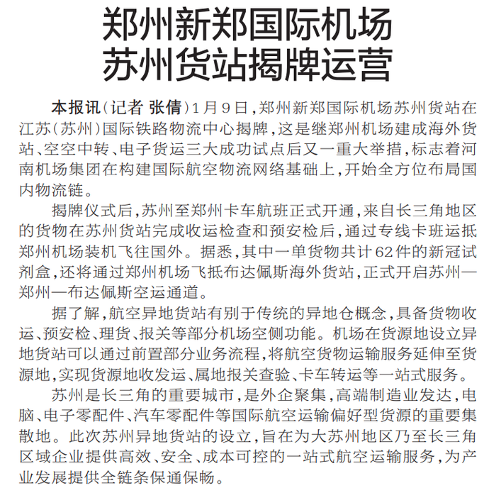 1月9日,郑州新郑国际机场苏州货站在江苏(苏州)国际铁路物流中心揭牌,这是继郑州机场建成海外货站、空空中转、电子货运三大成功试点后又一重大举措,标志着河南机场集团在构建国际航空物流网络基础上,开始全方位布局国内物流链。(今日《郑州日报》2版)