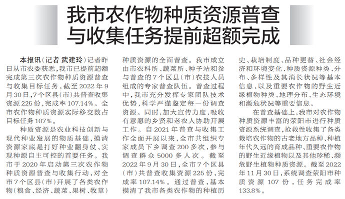 记者昨日从市农委获悉,我市已提前超额完成第三次农作物种质资源普查与收集目标任务,截至2022年9月30日,7个区县(市)共普查收集资源225份,完成率107.14%。全市农作物种质资源实际移交数占目标任务107%。(今日《郑州日报》2版)