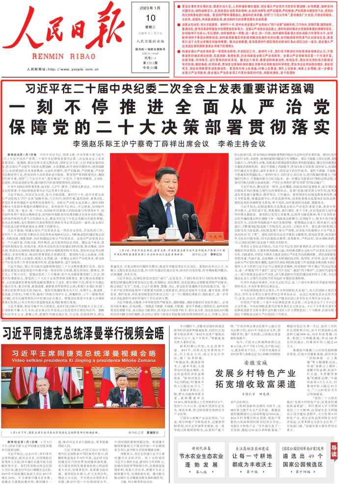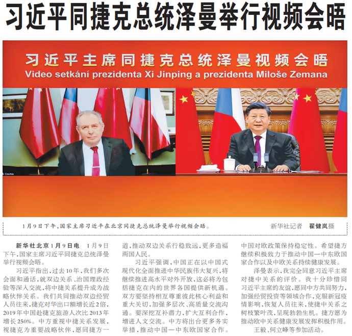 1月9日下午,国家主席习近平同捷克总统泽曼举行视频会晤。(今日《人民日报》1版)