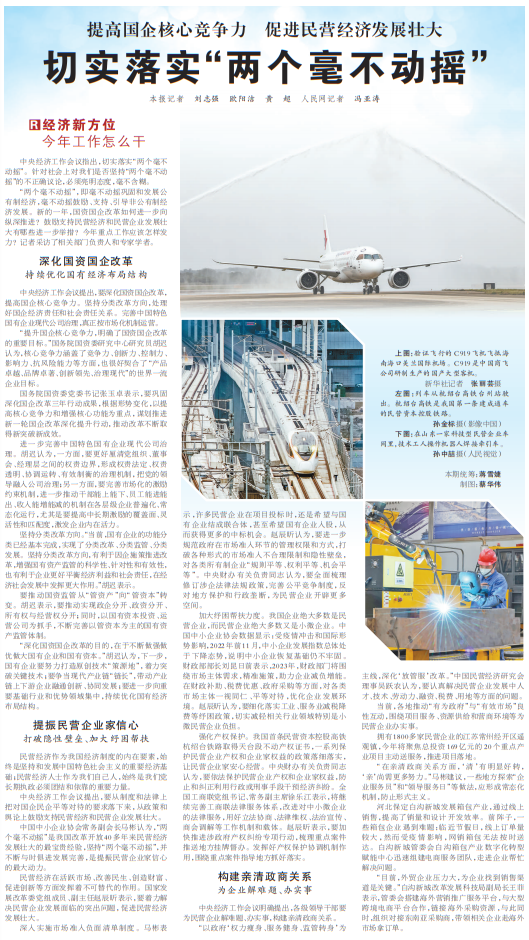 “两个毫不动摇”,即毫不动摇巩固和发展公有制经济,毫不动摇鼓励、支持、引导非公有制经济发展。新的一年,国资国企改革如何进一步向纵深推进?鼓励支持民营经济和民营企业发展壮大有哪些进一步举措?今年重点工作应该怎样发力?记者采访了相关部门负责人和专家学者。(今日《人民日报》2版)