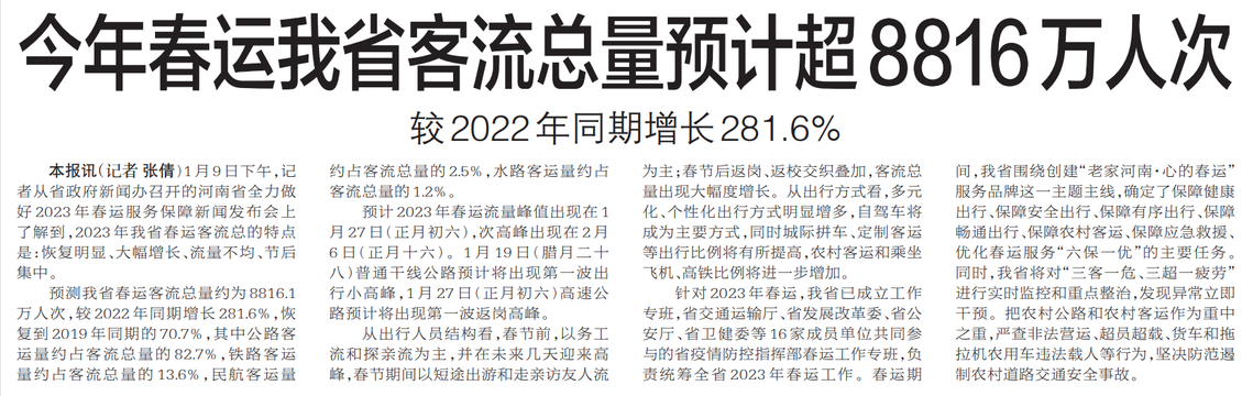 1月9日下午,记者从省政府新闻办召开的河南省全力做好2023年春运服务保障新闻发布会上了解到,2023年我省春运客流总的特点是:恢复明显、大幅增长、流量不均、节后集中。(今日《郑州日报》5版)