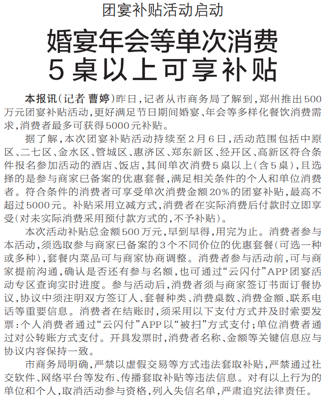 昨日,记者从市商务局了解到,郑州推出500万元团宴补贴活动,更好满足节日期间婚宴、年会等多样化餐饮消费需求,消费者最多可获得5000元补贴。(今日《郑州日报》5版)