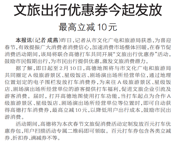 昨日,记者从市文化广电和旅游局获悉,为喜迎春节,有效提振广大消费者消费信心,加速消费市场整体回暖,在春节促消费活动期间,该局将联合高德打车共同开展“文旅出行优惠券”活动,鼓励市民假期出行,为市民出行提供优惠,激发文旅消费潜力。(今日《郑州日报》5版)