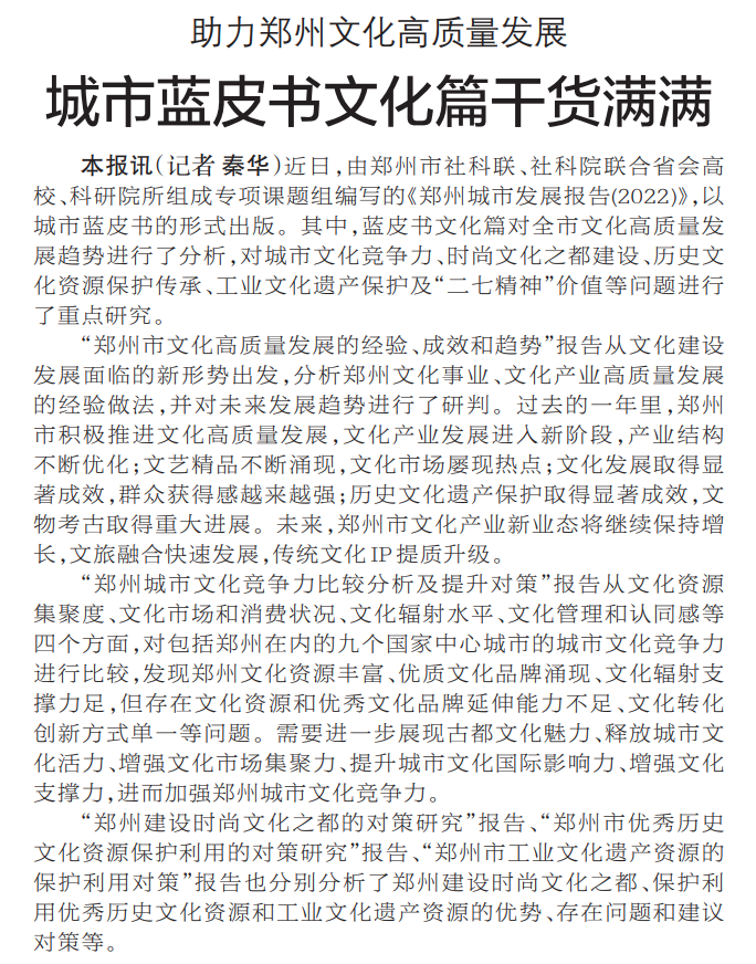 近日,由郑州市社科联、社科院联合省会高校、科研院所组成专项课题组编写的《郑州城市发展报告(2022)》,以城市蓝皮书的形式出版。其中,蓝皮书文化篇对全市文化高质量发展趋势进行了分析,对城市文化竞争力、时尚文化之都建设、历史文化资源保护传承、工业文化遗产保护及“二七精神”价值等问题进行了重点研究。(今日《郑州日报》5版)