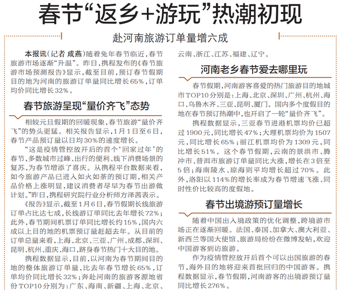 随着兔年春节临近,春节旅游市场逐渐“升温”。昨日,携程发布的《春节旅游市场预测报告》显示,截至目前,预订春节假期目的地为河南的旅游订单量同比增长65%,订单均价同比增长32%。(今日《郑州日报》5版)