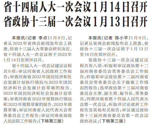 1月9日,记者从2023年省两会新闻发布会上获悉,经省十三届人大常委会研究决定,省十四届人大一次会议将于2023年1月14日在郑州召开。(今日《河南日报》1版、3版)