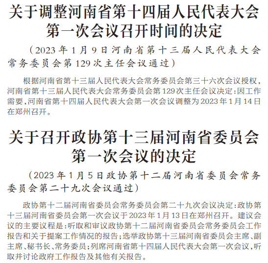 根据河南省第十三届人民代表大会常务委员会第三十六次会议授权,河南省第十三届人民代表大会常务委员会第129次主任会议决定:因工作需要,河南省第十四届人民代表大会第一次会议调整为2023年1月14日在郑州召开。(今日《河南日报》3版)