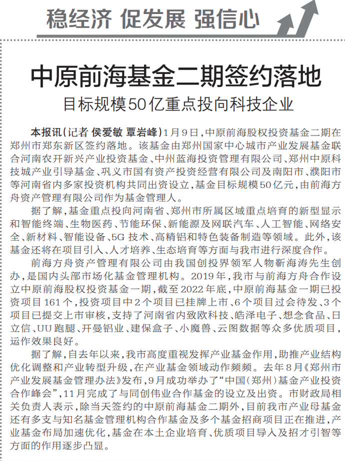 1月9日,中原前海股权投资基金二期在郑州市郑东新区签约落地。该基金由郑州国家中心城市产业发展基金联合河南农开新兴产业投资基金、中州蓝海投资管理有限公司、郑州中原科技城产业引导基金、巩义市国有资产投资经营有限公司及南阳市、濮阳市等河南省内多家投资机构共同出资设立,基金目标规模50亿元,由前海方舟资产管理有限公司作为基金管理人。(今日《郑州日报》7版)
