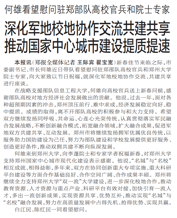 新春佳节来临之际,市委副书记、市长何雄近日带队看望慰问驻郑部队高校官兵和郑州大学院士专家,向大家致以节日祝福,就深化军地校地协作交流、共建共享进行座谈。(今日《郑州日报》1版)