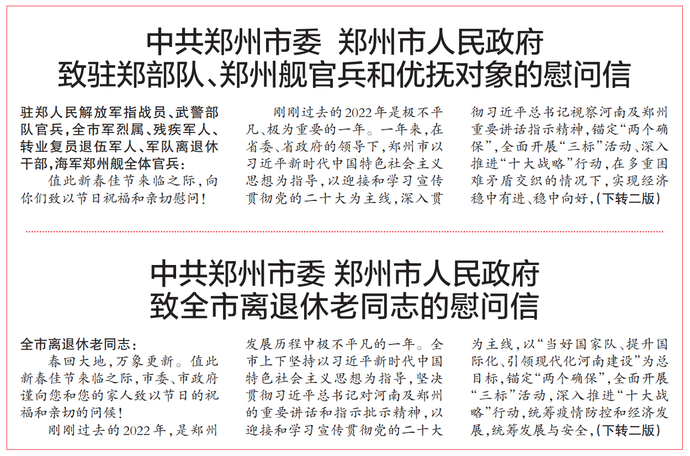 值此新春佳节来临之际,向你们致以节日祝福和亲切慰问!(今日《郑州日报》1版、2版)