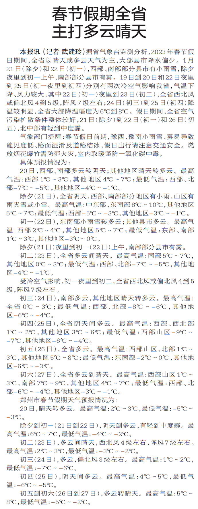 据省气象台监测分析,2023年春节假日期间,全省以晴天或多云天气为主,大部县市降水偏少。1月21日(除夕)和22日(初一),西部、南部部分县市有小雨雪,除夕夜里到初一上午,南部部分县市有雾。19日到20日和22日夜里到25日(初一夜里到初四)分别有两次冷空气影响我省,气温下降、风力较大,其中22日(初一)夜里到23日(初二),全省西北风或偏北风4到5级,阵风7级左右;24日(初三)到25日(初四)降温较明显,全省大部降温幅度为6℃到8℃。假日期间,全省空气污染扩散条件整体较好,21日(除夕)到22日(初一)和26日(初五),北中部有轻到中度霾。(今日《郑州日报》5版)