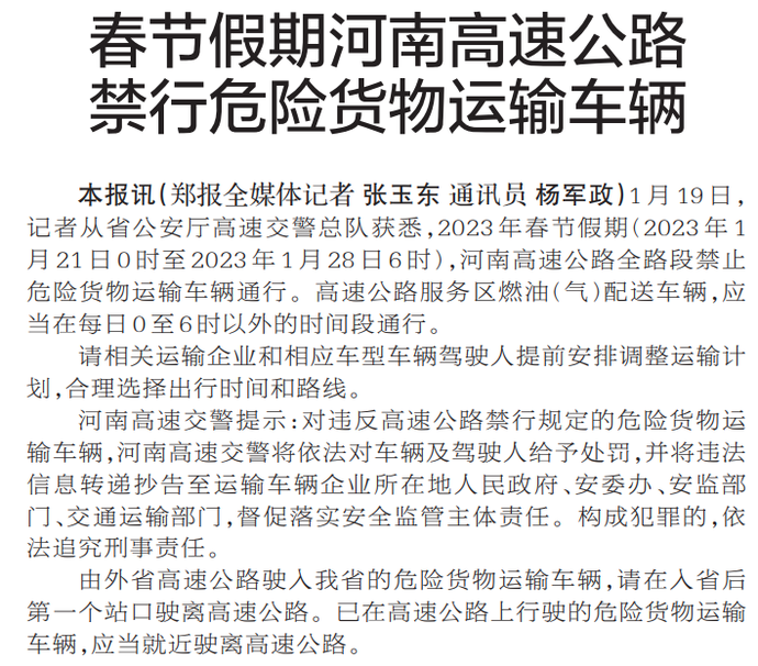 1月19日,记者从省公安厅高速交警总队获悉,2023年春节假期(2023年1月21日0时至2023年1月28日6时),河南高速公路全路段禁止危险货物运输车辆通行。高速公路服务区燃油(气)配送车辆,应当在每日0至6时以外的时间段通行。(今日《郑州日报》5版)